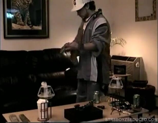 Fresh from military deployment, Dino arrives with his friend. They all hang out for a while, before Dino heads to the bedroom for his session. After stripping down he pulls out his big 9 inch cock and starts stroking it to the porn video playing. Dino's monster dick soon blossoms and he works it hard until the cum starts pumping.
