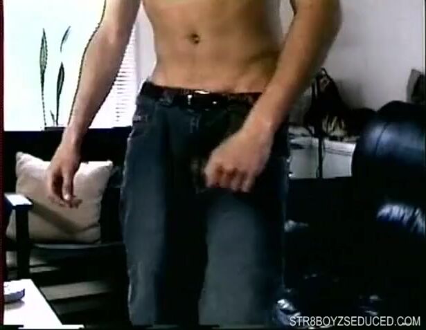 Straight boy Dino peels off his shirt to reveal his awesome body. He unzips his jeans and pulls out a growing cock. Dino strokes it until its rock hard and then stands and strips for the camera. Vinni