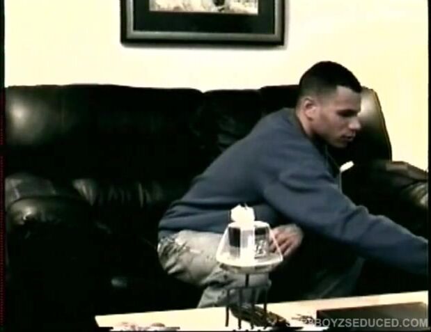 After straight boy Dino strips down to his socks he starts playing with his thick, uncut cock. As soon as it's nice and hard I go over to him and start stroking his cock as he holds it at the base. He