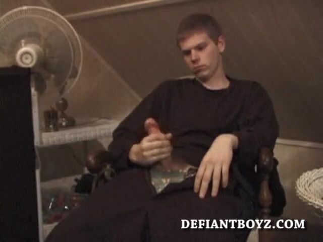 When we look in on Christian, he already has his hard cock out of his pants and he's giving it a real good stroking. It doesn't take long before he spills his nut, but Christian continues jacking off and soon he squeezes out a second cum load.