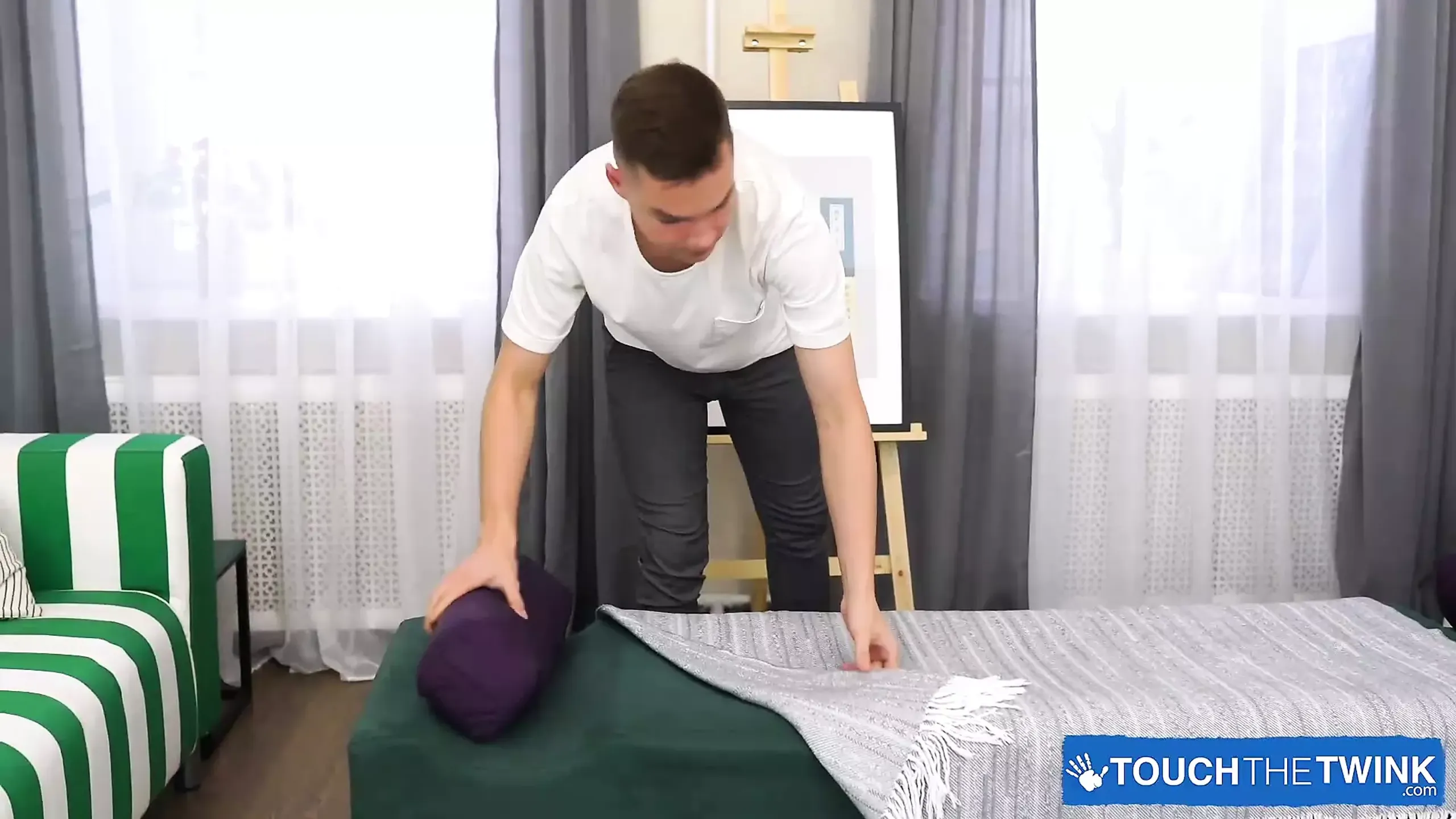 Adam has Kalvin strip off his pants and lie down on the table and Adam just happens to notice the bulge in the jockstrap Kalvin is wearing.