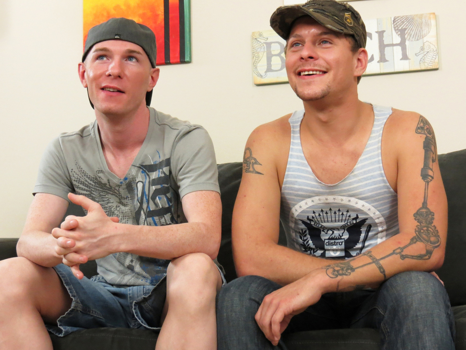 Two sexy country boys who were High School buddies now get to cum on our couch. These two big dicked buddies are ready to stroke one another's cock.