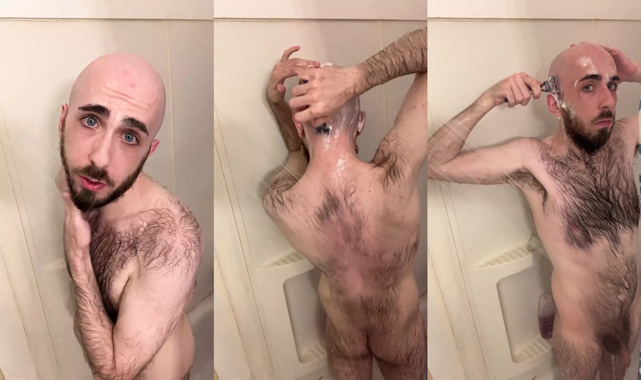 Very hairy skinny blue-eyed white guy shaves his head in the showet