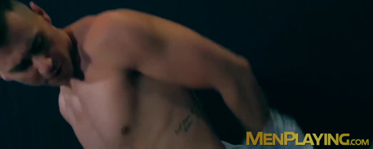 Suit and tie hunk jerks off to porn before stud joins to mount his fat cock for intense analriding.