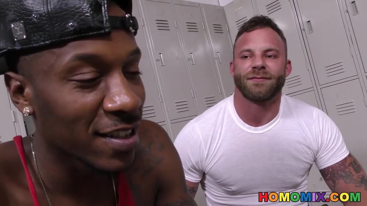 Bearded tattooed white man gets assfucked by a hung black man in the locker room