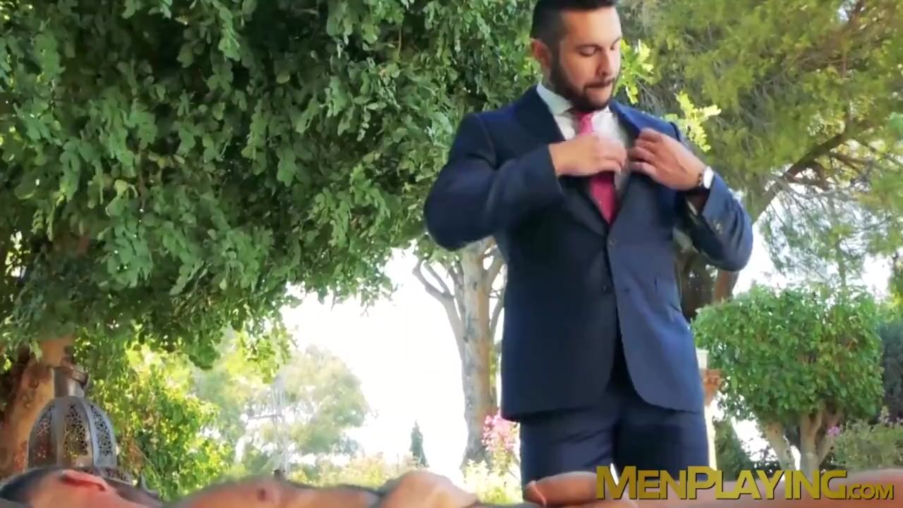 Classy gay in a suit and tie finds a naked hunk outdoors and ends up riding his rock hard dick.